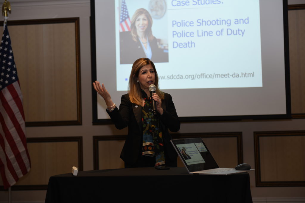 本次立法论文大赛的主题是今年七月份刚刚通过的AB-392法案(五月份选题时仍在议会讨论中),关于警察使用致命武力的合法性界定问题。县检察长Summer Stephan的发言从执法者的角度介绍了警察日常工作的危险性,还描述了警察所接受的减少使用致命武力的训练,也列举了关于本县警察枪击事件的各项统计数据,还直接阐述了AB-392的相关情况,为参赛的同学们提供了第一手的详尽资料。她还回答了在场听众的问题,她对所从事工作各项数据的熟悉程度令在场听众折服。