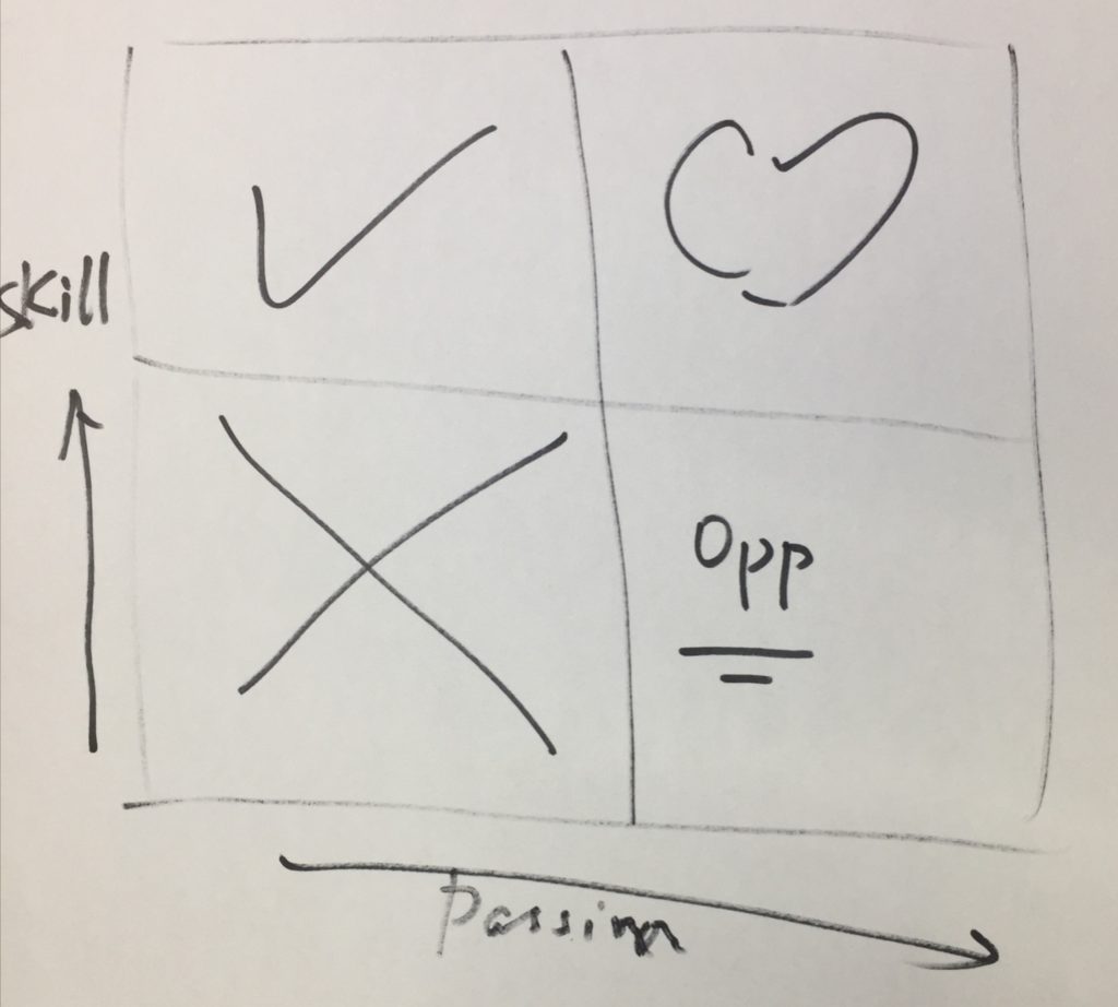 - 低skill+缺passion, 这个属于混,肯定不行,得改变,不改变的话,会被干掉的。- 高skill+缺passion, 技术属于大拿,但兴趣缺缺,属于能混的一个comfort zone, 职场中,不少属于此类;- 低skill+有passion, 会使劲学,提高skill的;- 高skill+有passion, 这个很lucky,很好。。。