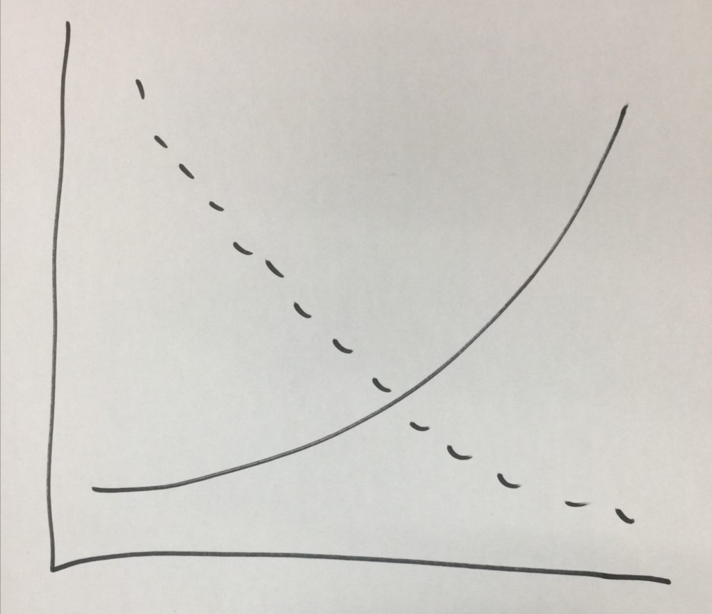 - 一条随着年龄的增长,你对于公司的综合价值,(越来越低);- 另一条是随着年龄的增长,公司对于你的liability、负担(越来越重)