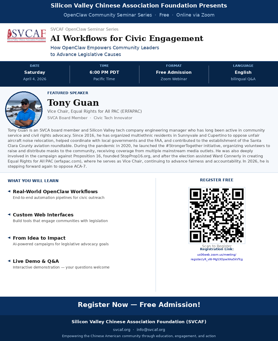 Join us for a free community seminar featuring Tony Guan, Vice Chair of Equal Rights for All PAC (ERFAPAC) and SVCA board member, as he shares how he uses OpenClaw AI to build powerful workflows and web interfaces that advance civic engagement and legislative advocacy.