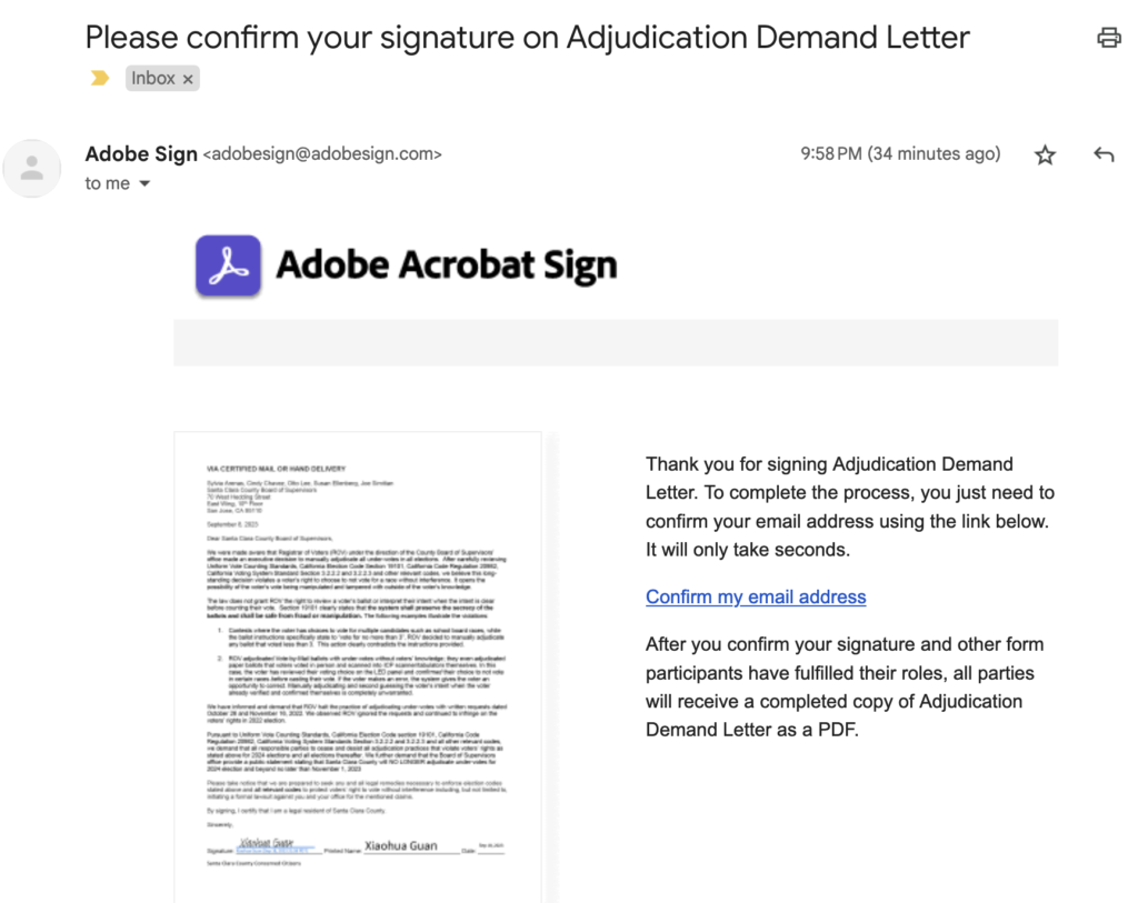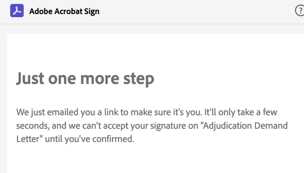 **步骤5: **查看您的电子邮箱,搜索刚刚收到的email,其标题为: “Please confirm your signature on Adjudication Demand Letter”, 来自”Adobe Sign”:
