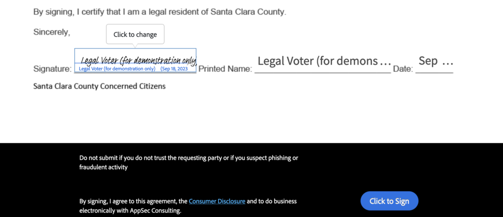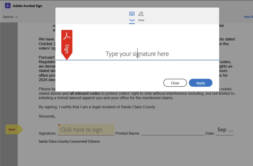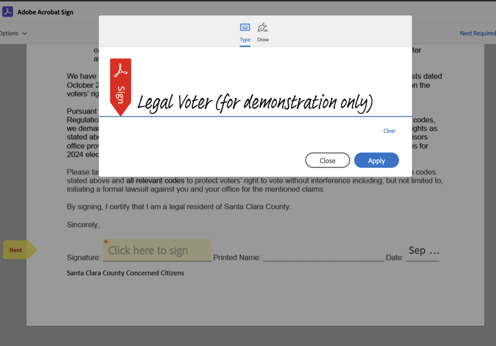 步骤3: 点击 “Click here to sign”,并在弹出窗口输入您注册选民的时候用的名字,再点击”Apply”按钮,您的电子签名和姓名会被自动填入电子文档。