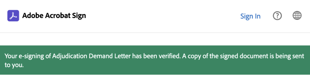 **步骤 6: **点击email里面的 “Confirm my email address“,然后会看到一个绿色的消息: “Your e-signing of Adjudication Demand Letter has been verified. A copy of the signed document is being sent to you.” 此时便大功告成!