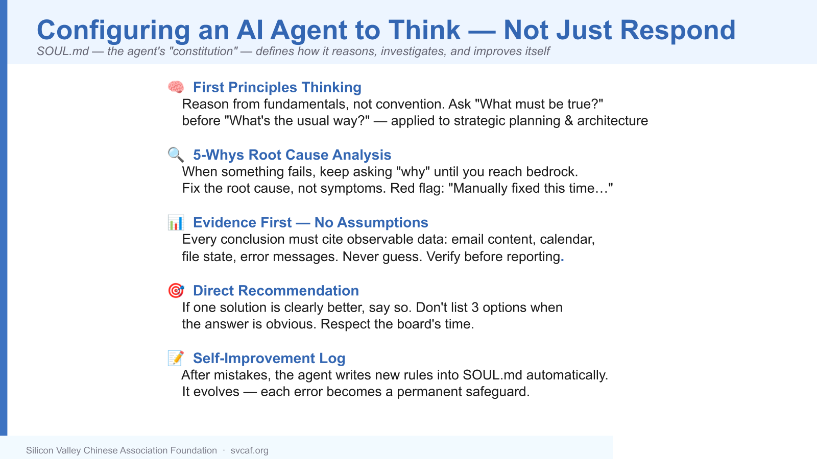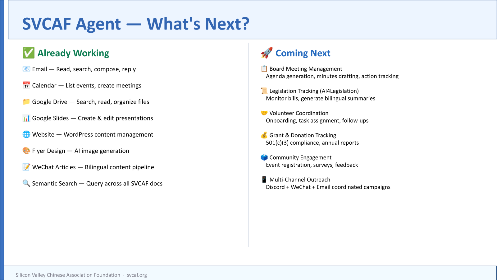 One of the most valuable takeaways: out of the box, an AI agent is a blank slate. What makes it powerful is how you configure it. SVCAF uses plain-text files — SOUL.md (the agent’s values and limits), AGENTS.md (operational rules), and MEMORY.md (long-term memory) — to give our agent a clear identity, workflow, and institutional knowledge.