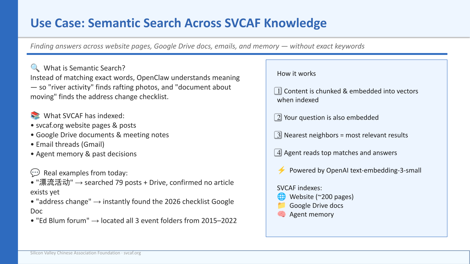 - Semantic Search: Query across 900+ SVCAF documents — meeting minutes, Drive files, website posts — using meaning, not just keywords. Example: searching “漂流活动” (rafting activity) instantly found relevant archived posts.