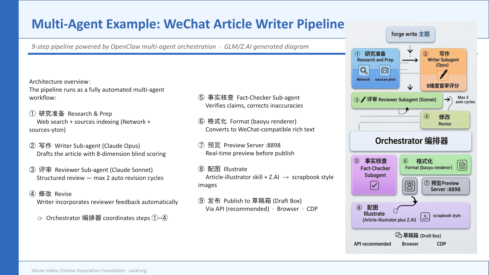 - WeChat Article Pipeline: A 9-step multi-agent workflow that takes an idea and produces a fully illustrated, fact-checked, WeChat-ready article draft in 5–10 minutes.